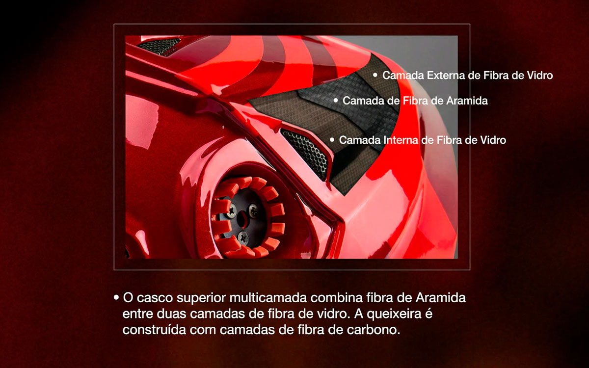 A curvatura do casco não é estética. O perfil aerodinâmico da camada externa foi projetado para reduzir o atrito no impacto, permitindo o desvio e a transferência mais eficiente de energia para proteger a cabeça do piloto da força direta, referida ao pescoço e à coluna vertebral.
