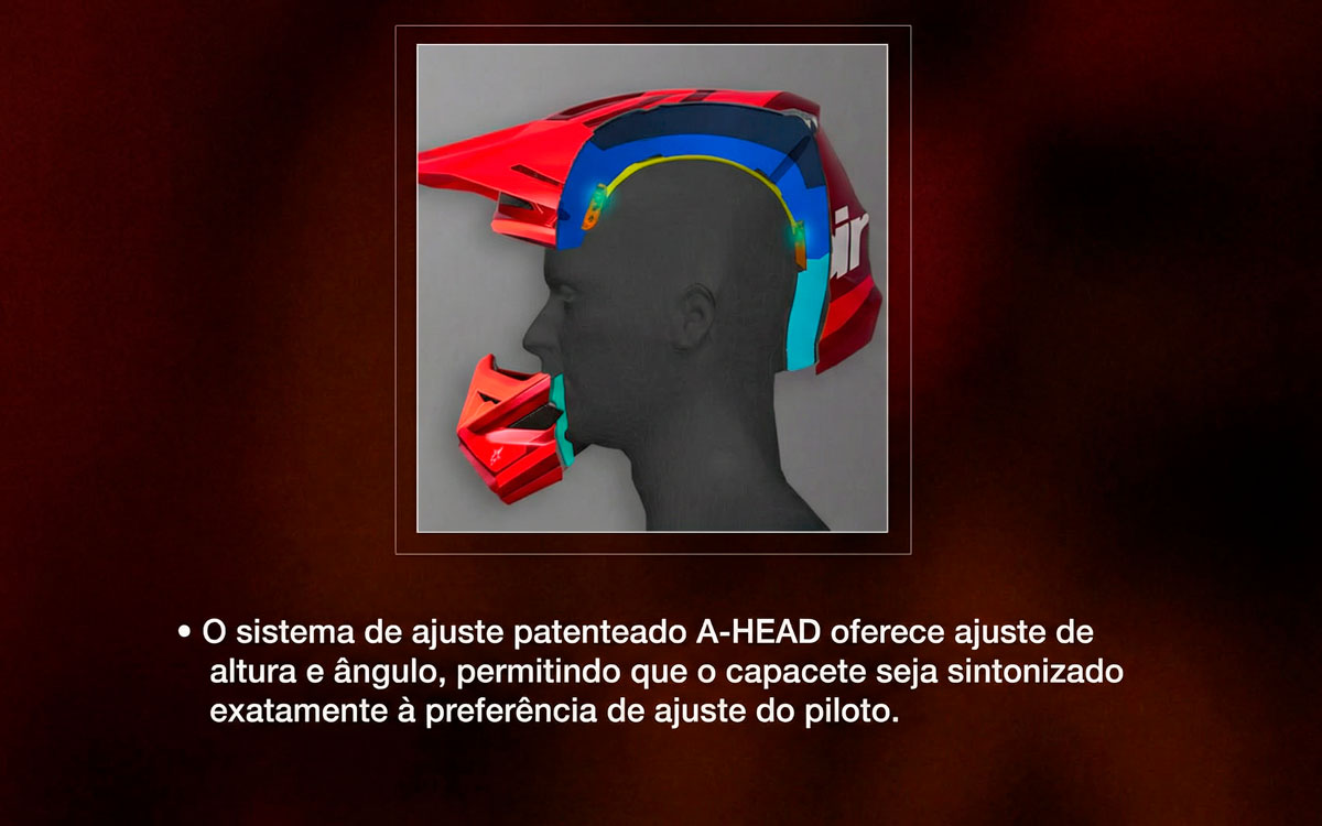 Por que isso importa? Porque cada cabeça tem uma geometria diferente. Capacetes que não têm esse sistema forçam você a usar almofadas mais grossas ou mais finas pra encontrar o ajuste, e quando você acerta o ajuste vertical, perde o horizontal. Com o A-Head, você ajusta a posição do capacete primeiro, depois calibra as almofadas de bochecha. O resultado é um encaixe anatômico de verdade, sem aquela pressão localizada que aparece depois de uma hora de trilha.
