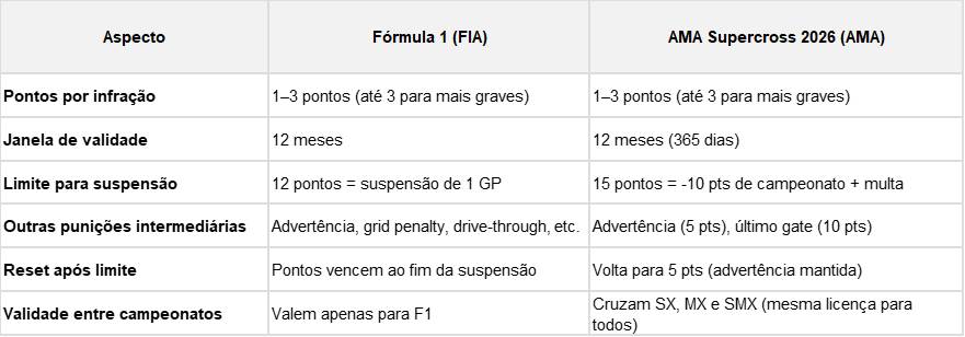 Diferença crucial: Na F1, atingir o limite resulta em suspensão automática de uma prova. No AMA, o limite de 15 pontos resulta em perda de pontos de campeonato e multa, mas não há suspensão automática de participação. A ideia é punir o campeonato, não barrar o piloto de correr.