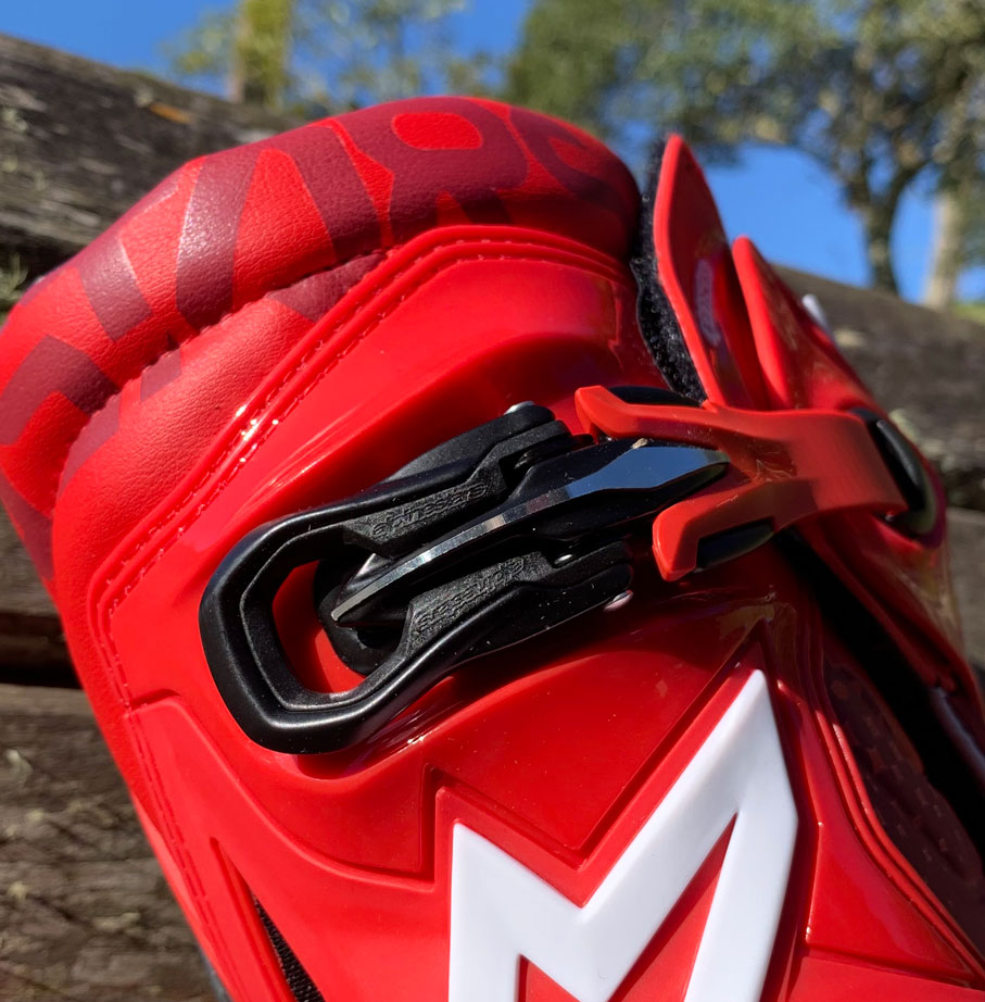 Para maior absorção dos impactos, o sistema DHCP (Dynamic Heel Compression Protector) auxilia a reduzir significativamente o efeito da energia excessiva gerada pelos impactos e ajudando a diminuir lesões. O novo sistema de fechamento, possui travas em alumínio de alta resistência à impactos e sistema de abre/fecha que se alinha automaticamente com a trava, otimizando o ajuste e a fixação, garantindo mais segurança e muito mais qualidade com a tradição Alpinestars.