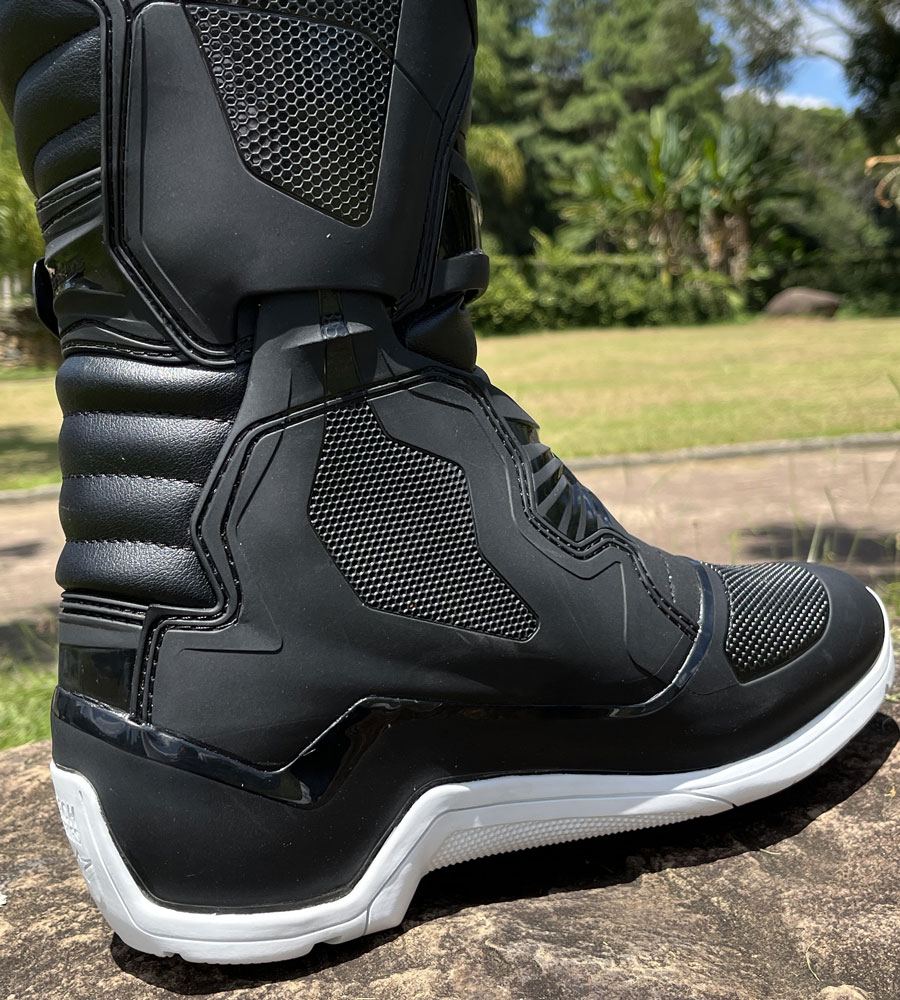 A parte superior do pé esquerdo conta com proteção e reforço para o uso do pedal de câmbio, otimizando as trocas e a durabilidade.
