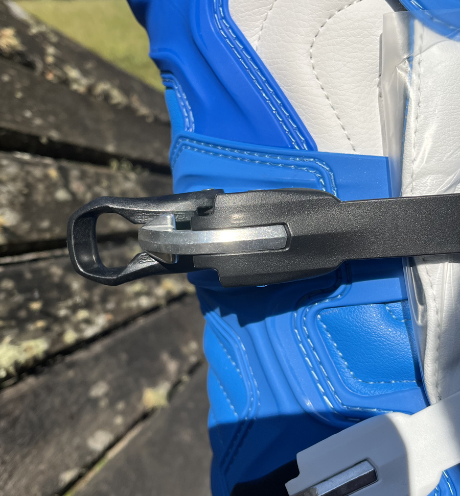O sistema de fechamento superior conta com velcro®, onde o ajuste junto à perna é maior, proporcionando ainda mais conforto e segurança para a pilotagem permitindo movimentações mais naturais e seguras com o conjunto de presilhas em polímero com travas em alumínio.