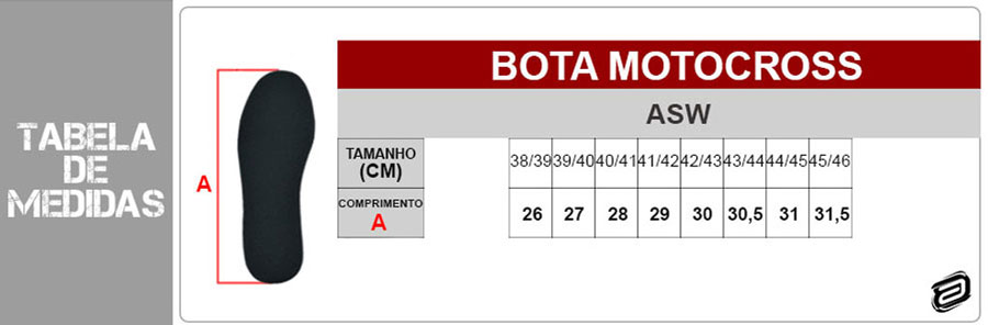 *As botas para motocross possuem ajuste mais preciso para melhor fixação junto aos pés. Por isso, recomenda-se a escolha de um número maior que o utilizado em calçados casuais.