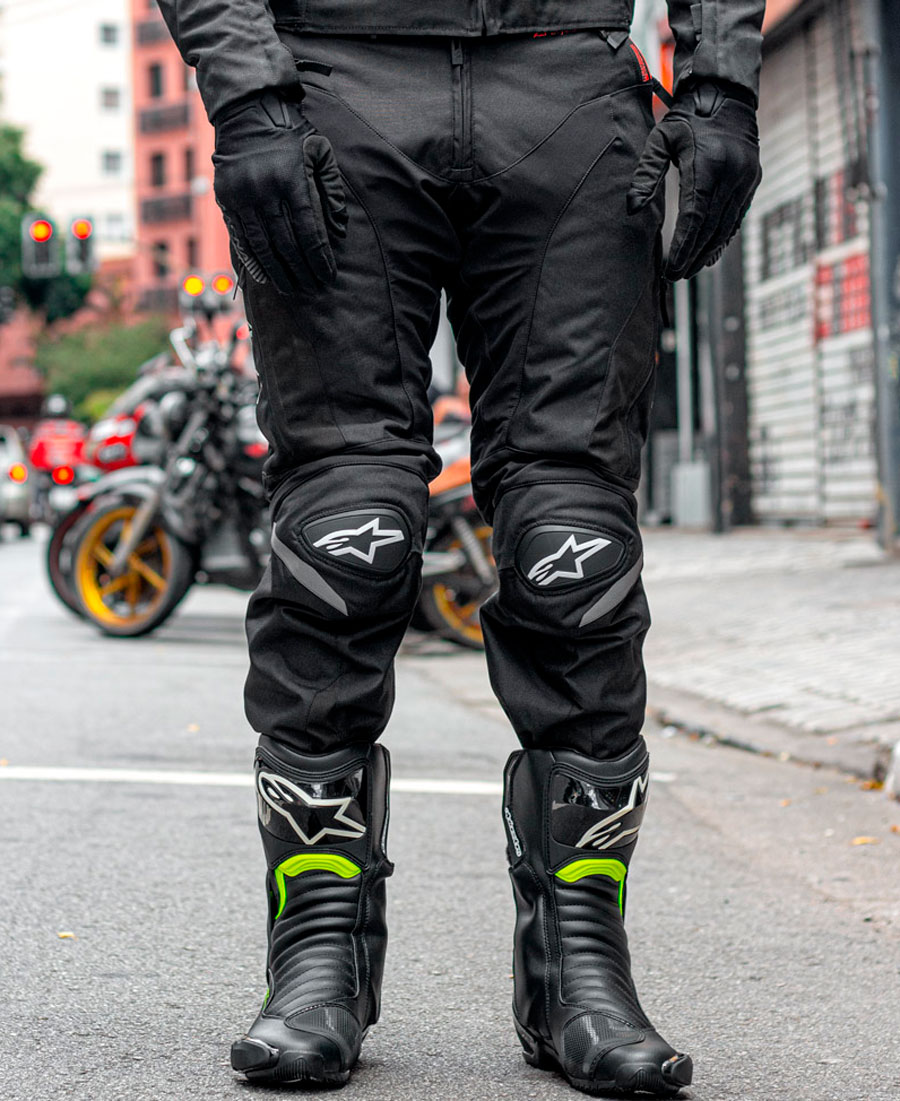 A Calça on-road Alpinestars T SPR Drystar - Impermeável possui protetores de joelho e canela com tecnologia DFS Lite® e GP-R Lite®, que oferecem proteção de alto nível contra impactos, elevando a segurança para enfrentar as velocidades mais altas.