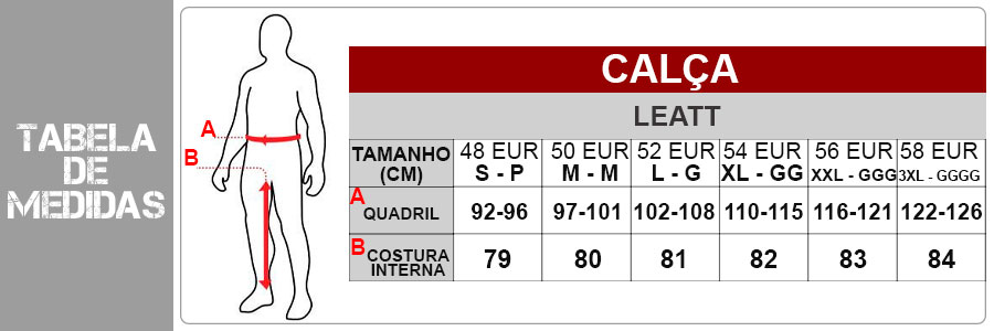 Confira as medidas da Calça Leatt Adventure Dritour 7.5 - Impermeável: