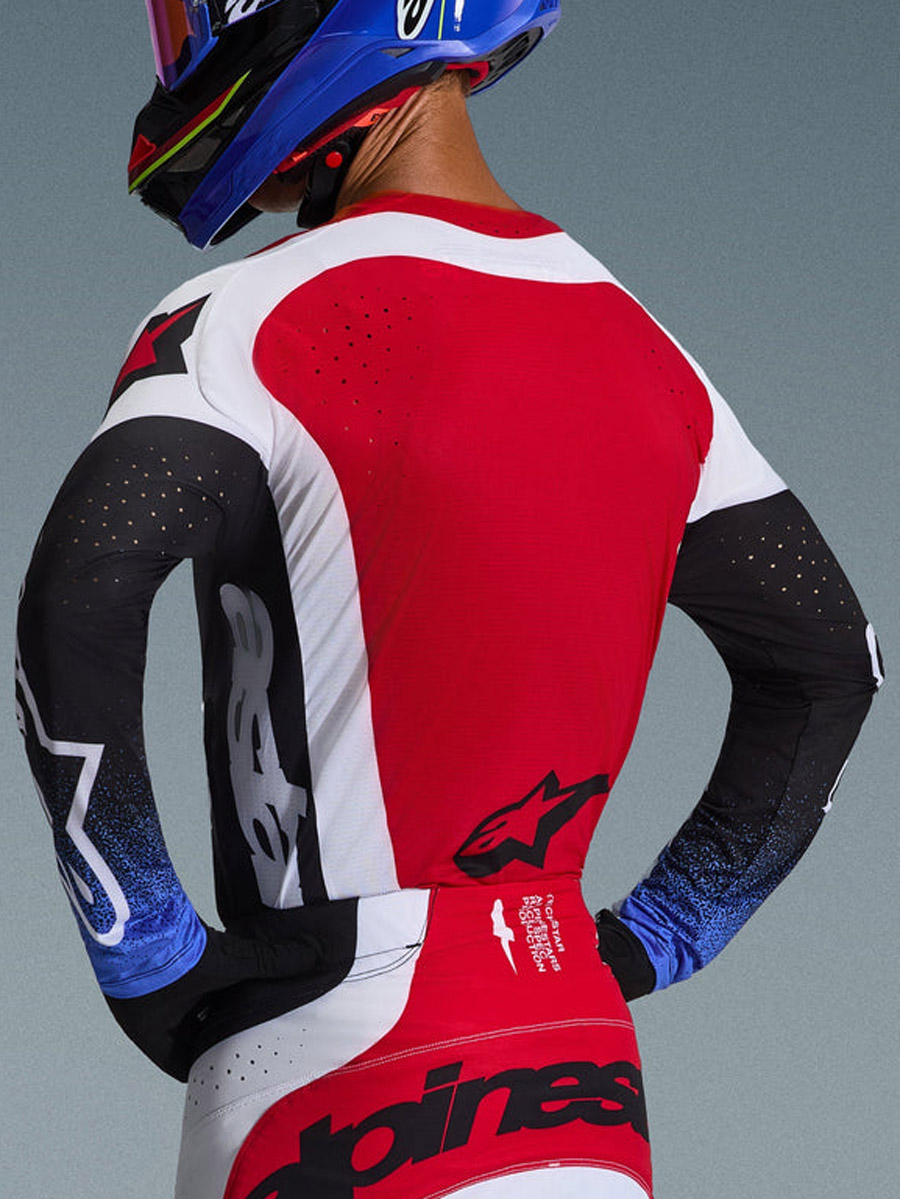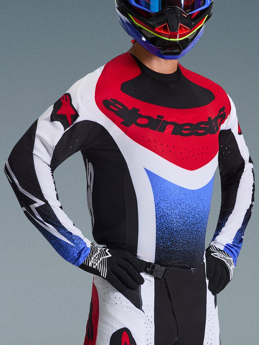 Além disso, a composição da Camisa para motocross Alpinestars Techstar 2026 inclui golas e mangas sem costura, facilitando o uso com protetores de pescoço e luvas de motocross, além de oferecer excelente respirabilidade para a pele durante todo o percurso.