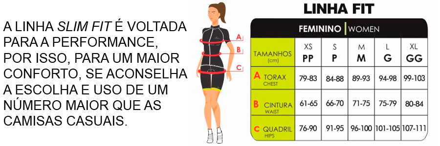 A Linha Fit Mauro Ribeiro possui caimento mais justo ao corpo, priorizando a alta performance e menor resistência aerodinâmica, sendo recomendável a utilização de um número maior para mais conforto ou o mesmo tamanho das roupas casuais para o máximo em performance.