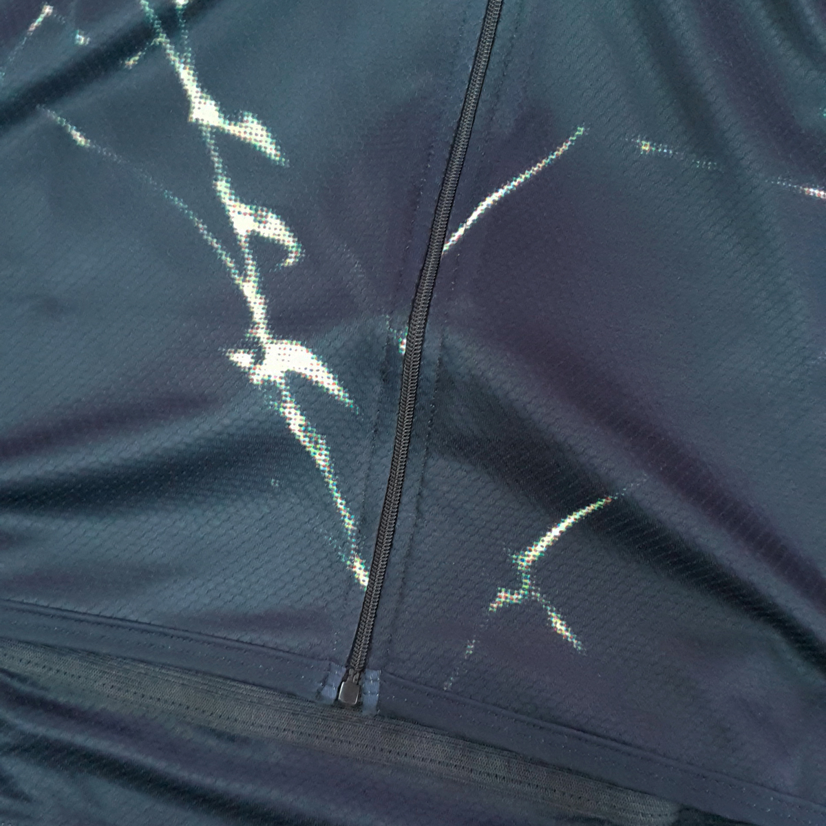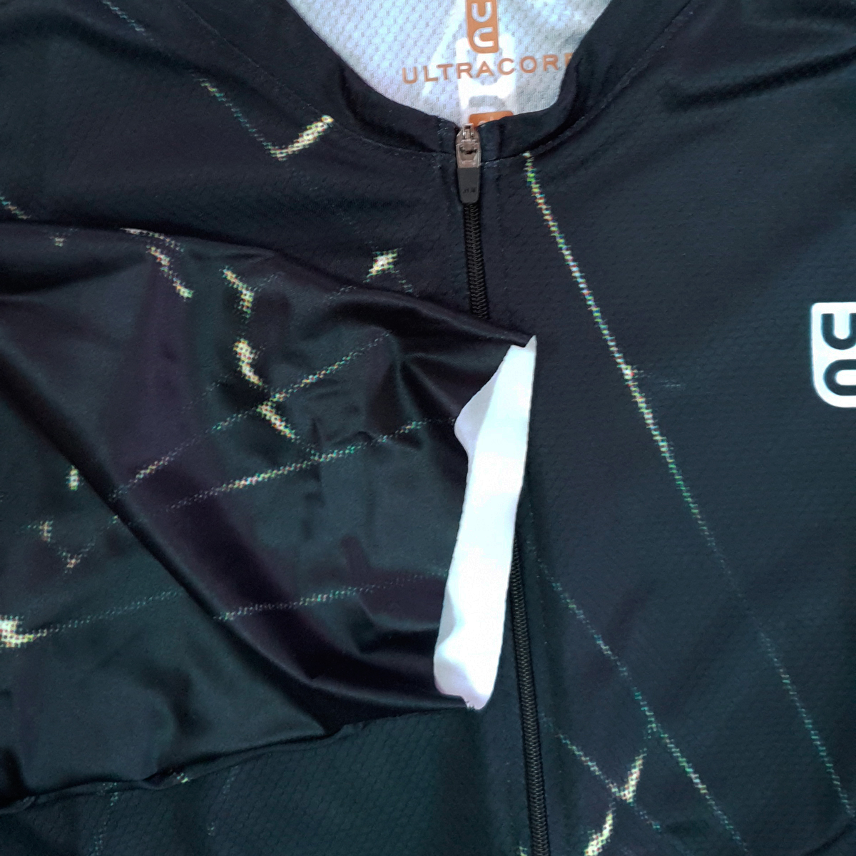 Camisa Ultracore Glass também possui zíper frontal de abertura 100% e os três bolsos traseiros tradicionais ideais para levar objetos de maior necessidade, como géis e ferramentas