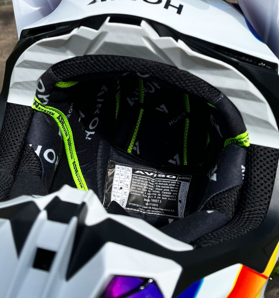 Já em seu interior, o Capacete de motocross Airoh Twist 3.0 é equipado com forração hipoalergênica, totalmente removível e lavável, com toque macio e tratamento antibacteriano, que garante conforto prolongado e controle de umidade.