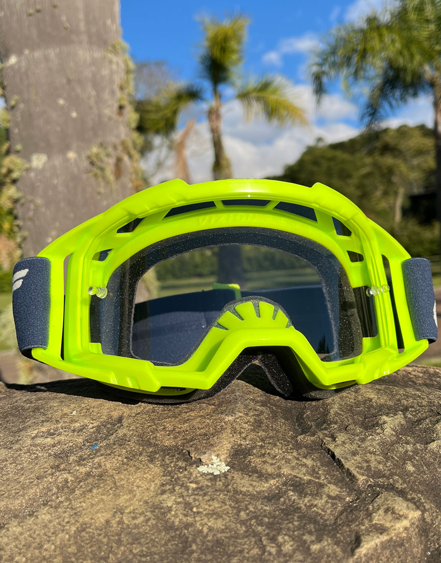 A transparência da lente permite uso versátil, seja em trilhas fechadas com sombra intensa ou em dias nublados e chuvosos, onde o excesso de coloração poderia prejudicar a visibilidade.