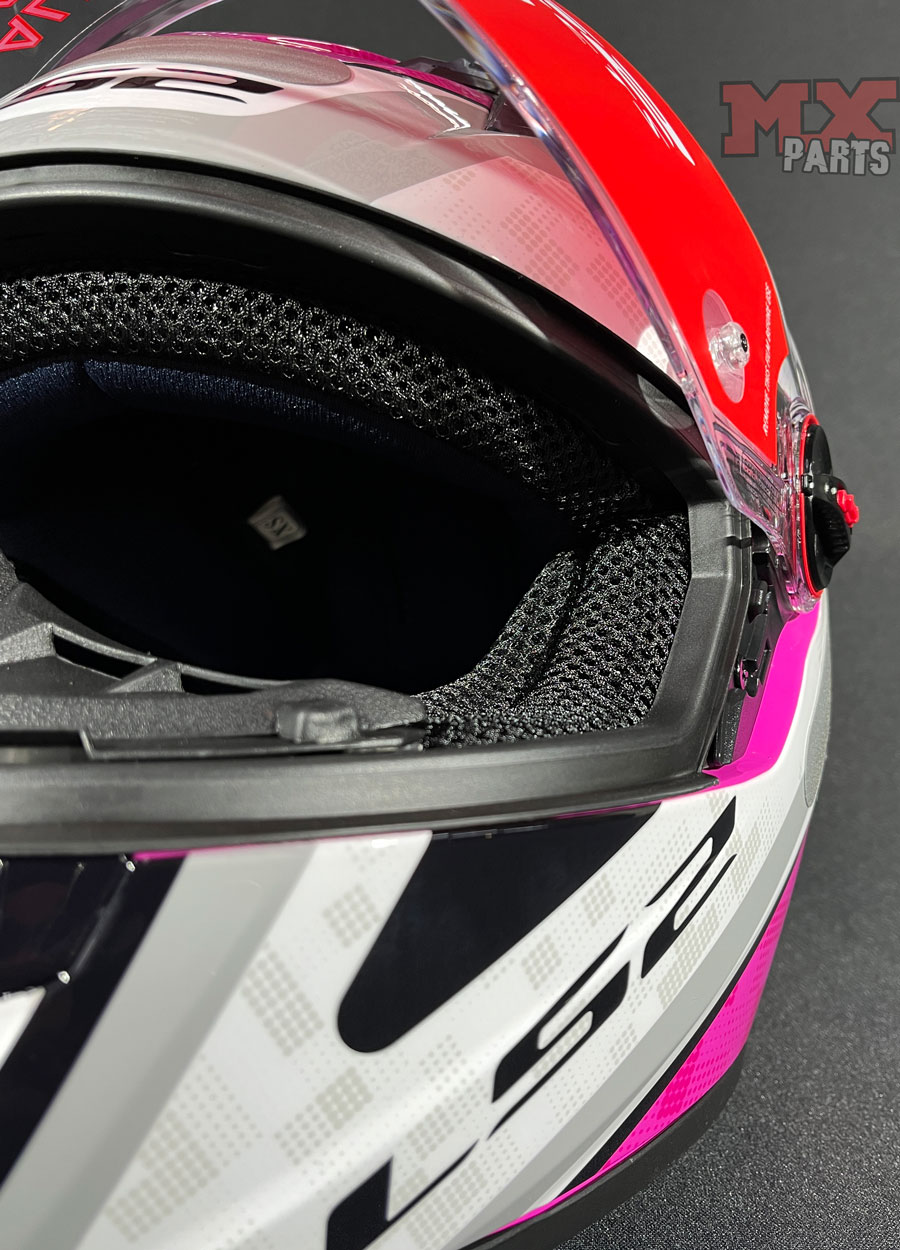 O interior do Capacete para on-road LS2 FF358 Pro reflete o compromisso da marca com o conforto térmico, a ergonomia e a higiene, além de ser projetado para otimizar o isolamento acústico, ao mesmo tempo em que permite a passagem de ar graças à integração inteligente com o sistema de ventilação.