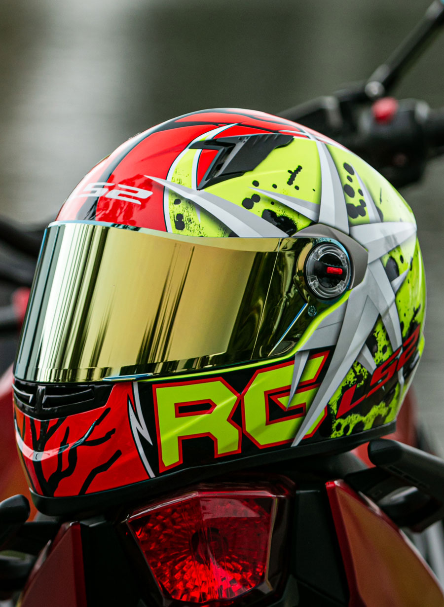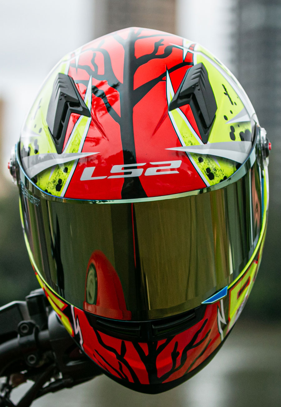 O sistema de troca da viseira é baseado no exclusivo LS2 Quick Release System, permitindo substituição rápida e prática, sem a necessidade de ferramentas, ideal para o piloto que deseja alternar entre viseiras transparentes, fumês e espelhadas.