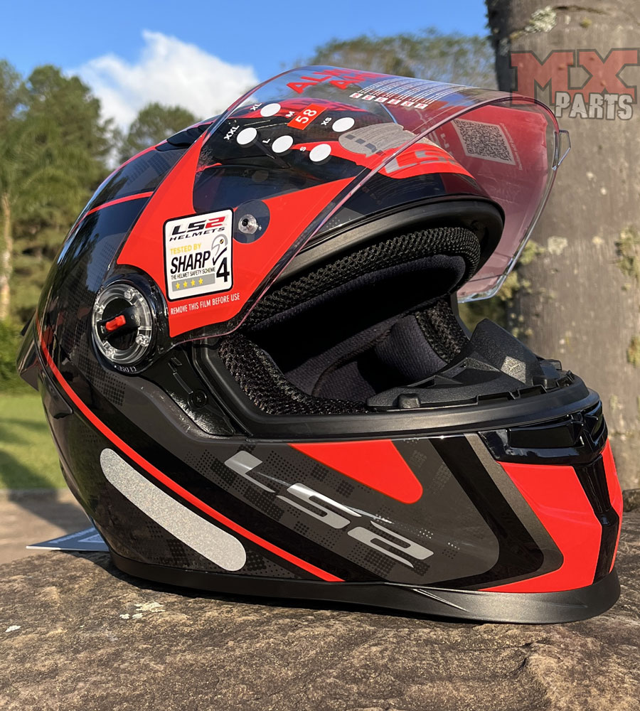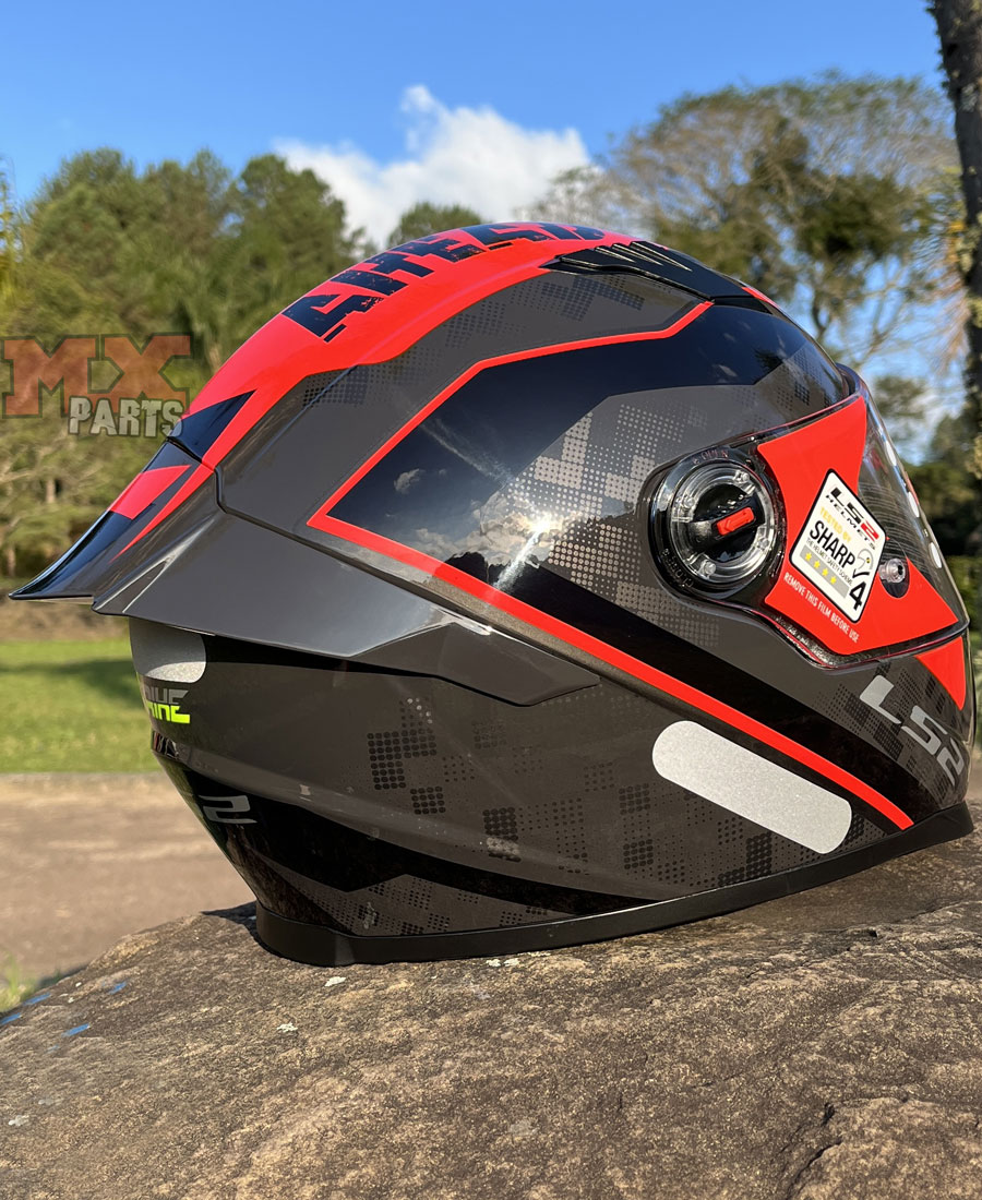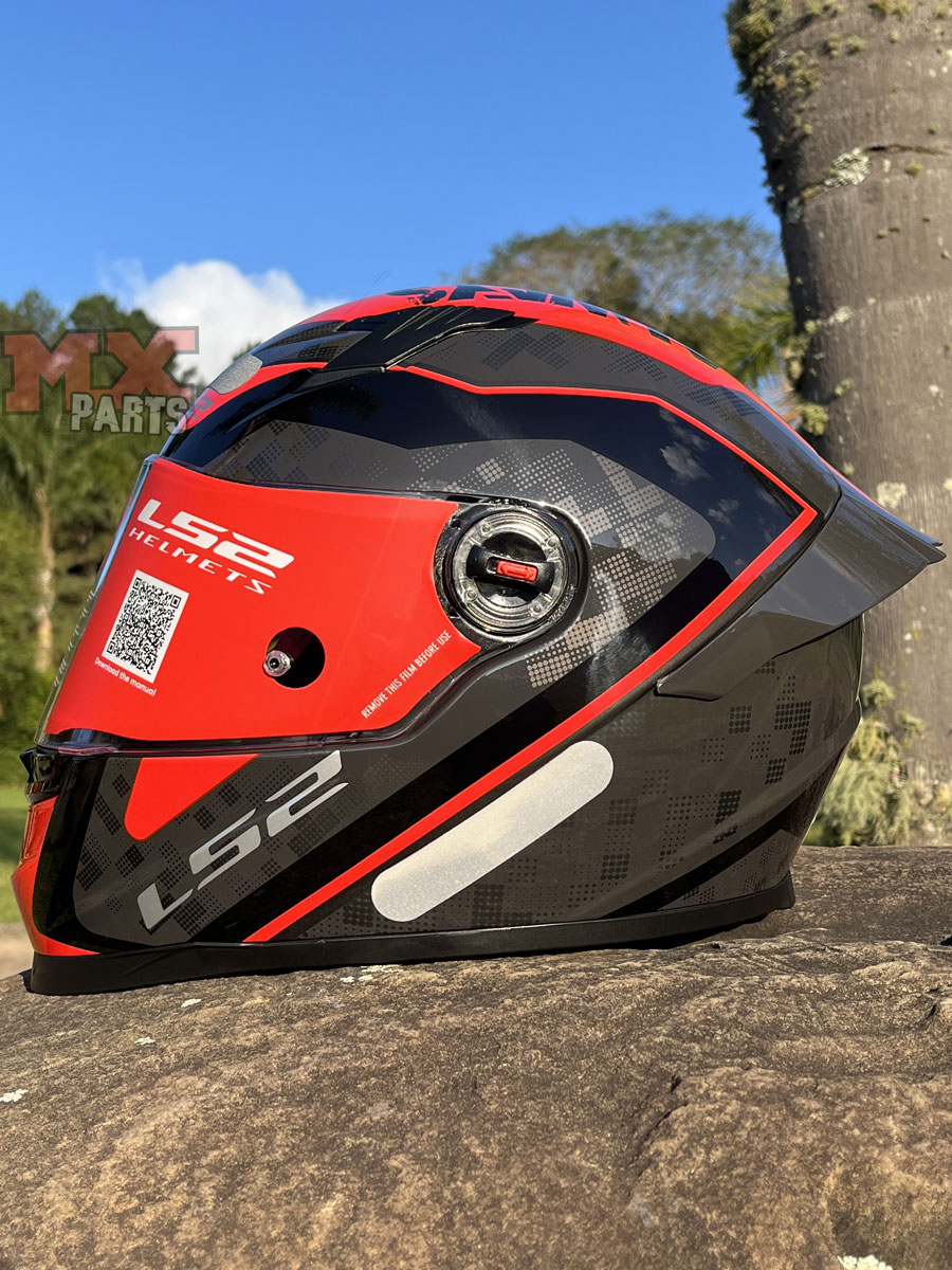 O sistema de troca da viseira é baseado no exclusivo LS2 Quick Release System, permitindo substituição rápida e prática, sem a necessidade de ferramentas, ideal para o piloto que deseja alternar entre viseiras transparentes, fumês e espelhadas.