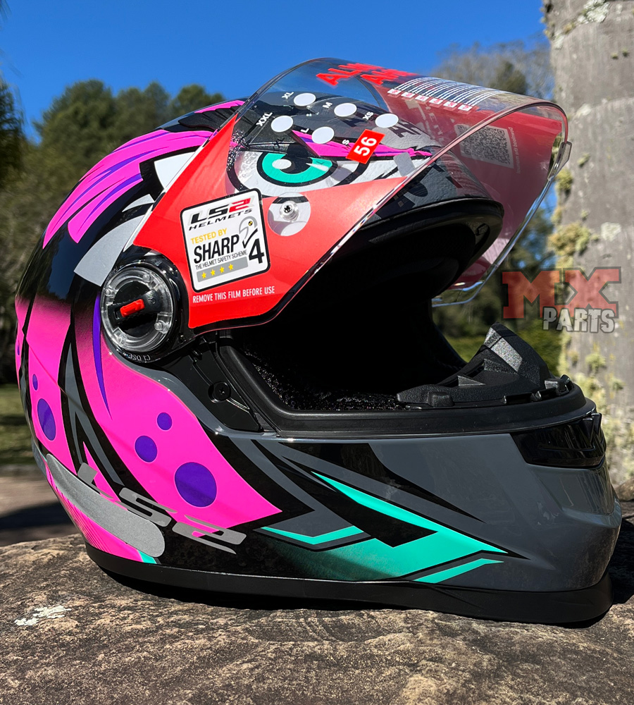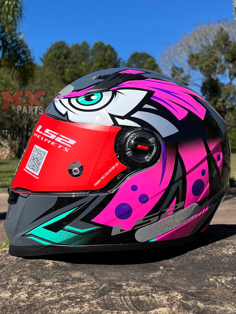 O sistema de troca da viseira é baseado no exclusivo LS2 Quick Release System, permitindo substituição rápida e prática, sem a necessidade de ferramentas, ideal para o piloto que deseja alternar entre viseiras transparentes, fumês e espelhadas.
