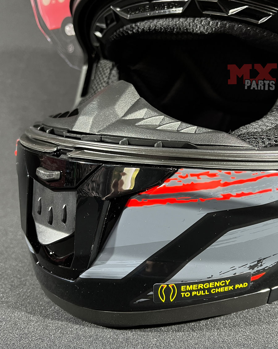 Ele é equipado com entradas e saídas de ar estrategicamente posicionadas para garantir uma eficiente circulação interna do ar, as entradas frontais localizadas na parte superior e no queixo captam o fluxo de ar durante a pilotagem, direcionando-o através de canais internos que percorrem toda a estrutura do capacete.