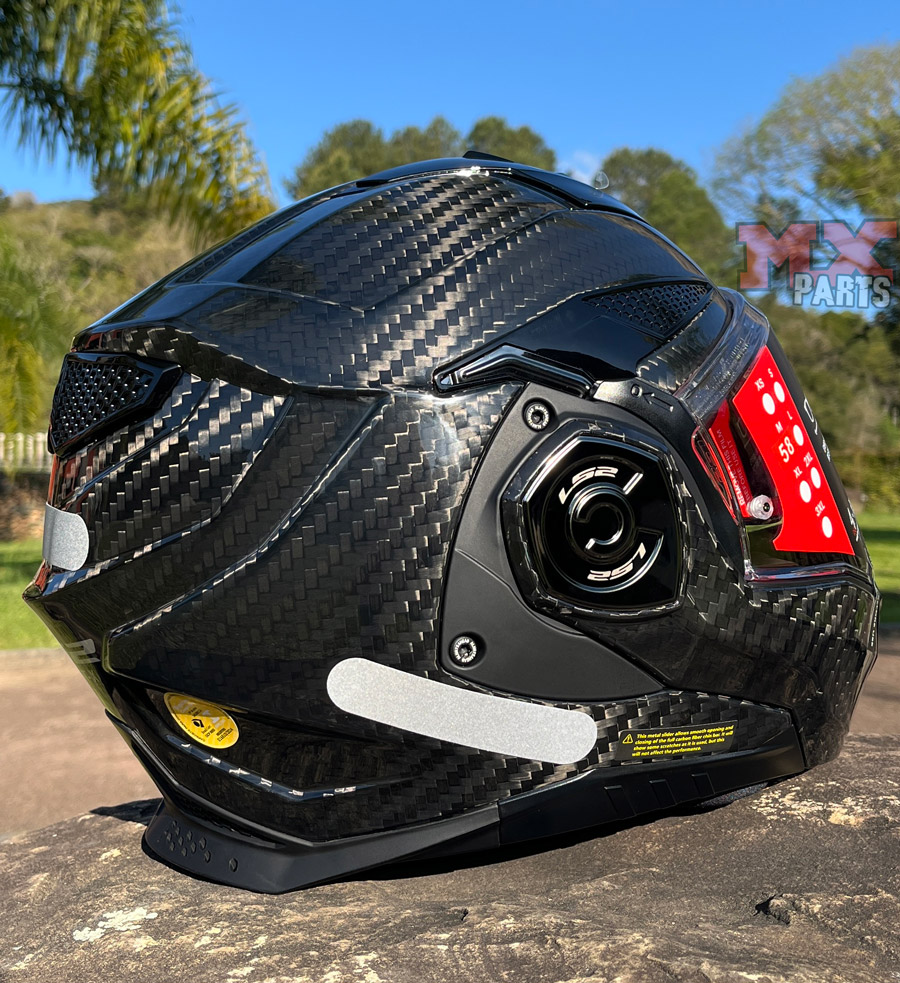 • Casco em fibra de carbono - o capacete é totalmente construído em fibra de carbono, incluindo a queixeira. Esse material é mundialmente reconhecido pelo seu altíssimo poder de absorção de impactos, mantendo a leveza extrema sem sacrificar a robustez