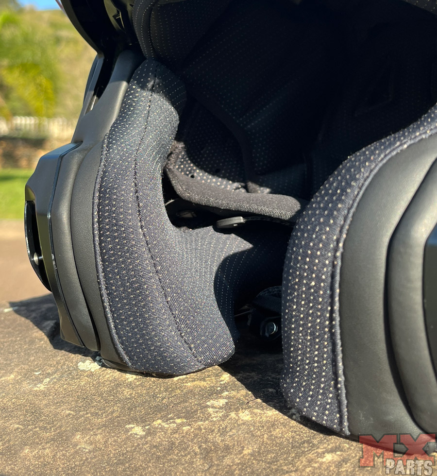 O interior do Capacete Articulado FF901 Advant X Carbon traz espuma cortada a laser, além de forração removível, lavável, hipoalergênica e confeccionada com o tecido patenteado X-Static®, que proporciona excelente sensação térmica e controle antibacteriano.