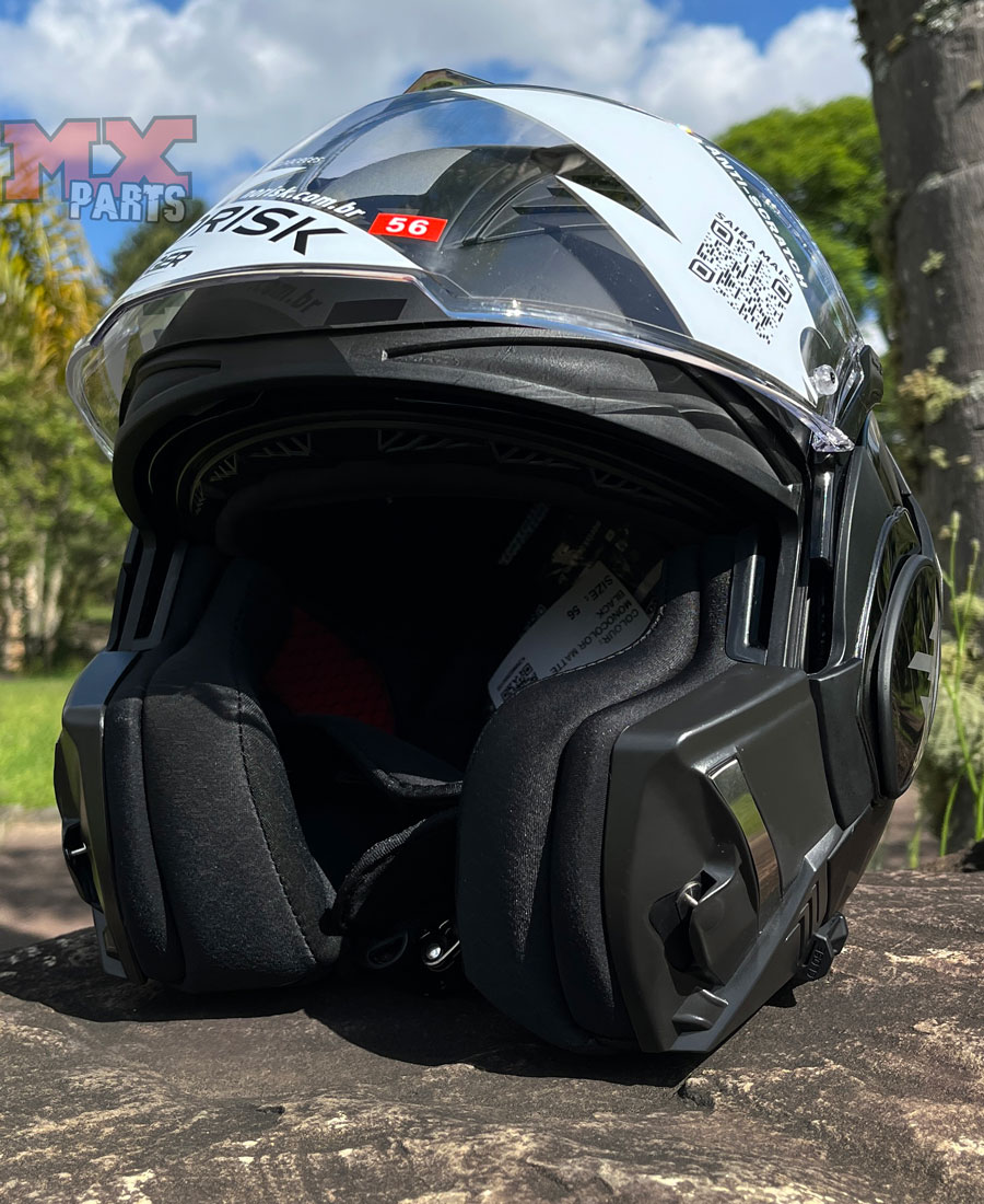 • Estrutura modular estilo flip-up - oferece versatilidade para o piloto ajustar conforme seu gosto ou necessidade, mudando facilmente de um capacete integral para um modelo aberto