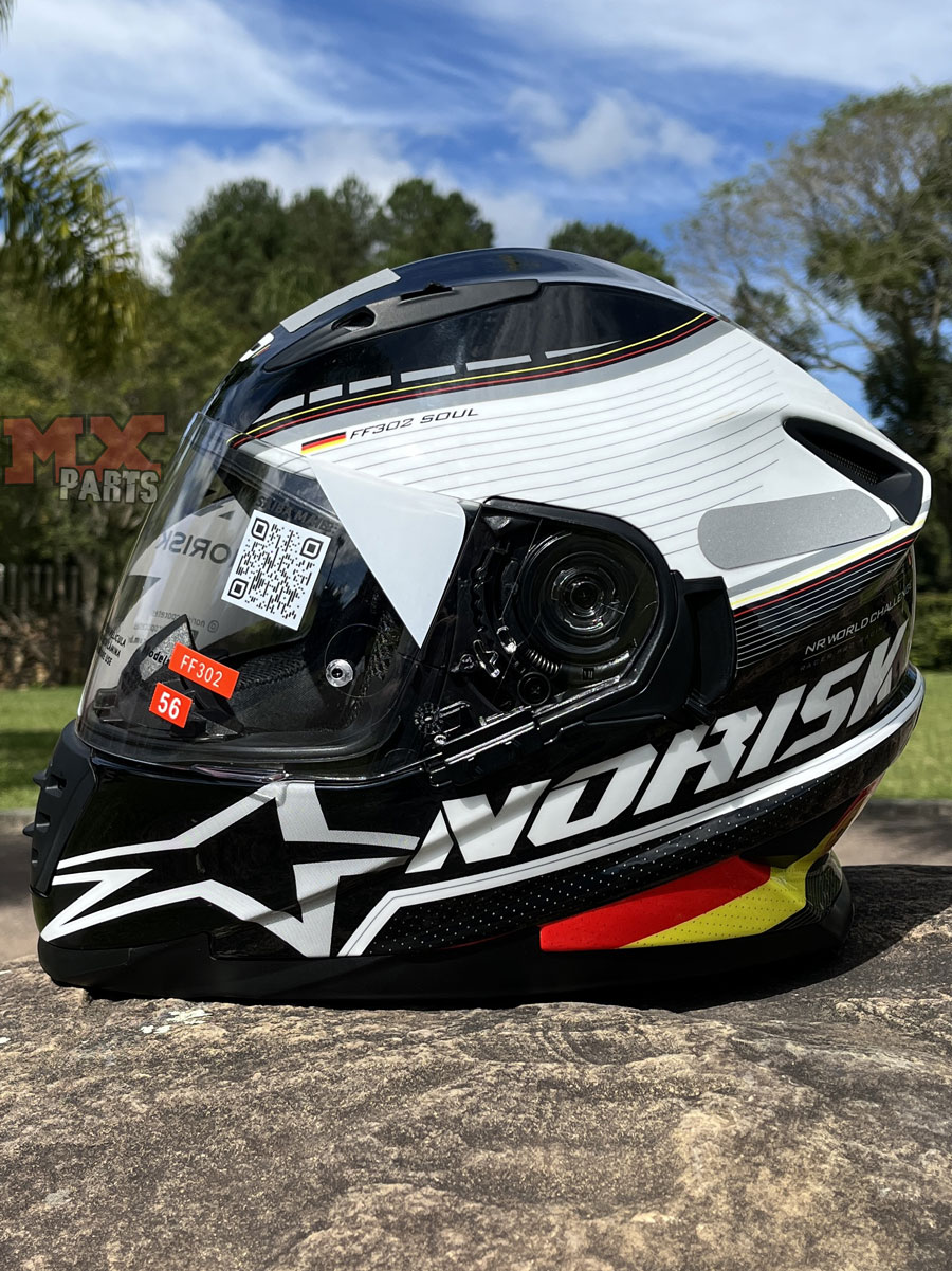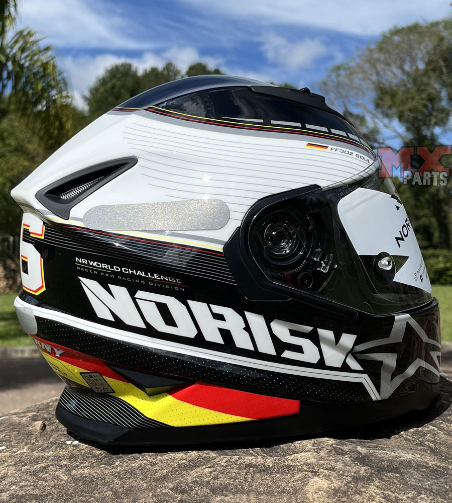 Além disso, o Capacete on-road Norisk FF302 Soul Alemanha conta com uma viseira solar interna, que pode ser acionada facilmente por um botão lateral, especialmente útil para quem pilota sob sol forte, pois elimina a necessidade de usar óculos escurose oferece uma solução prática e integrada para proteção contra a claridade excessiva.