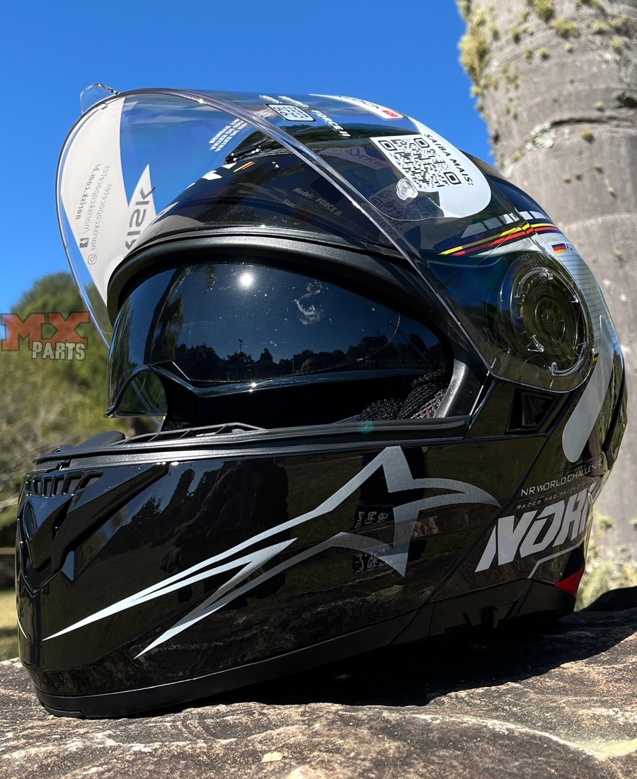 Capacete Norisk Force II Articulado é equipado com um sistema completo de viseiras, proporcionando conforto visual e proteção superior.