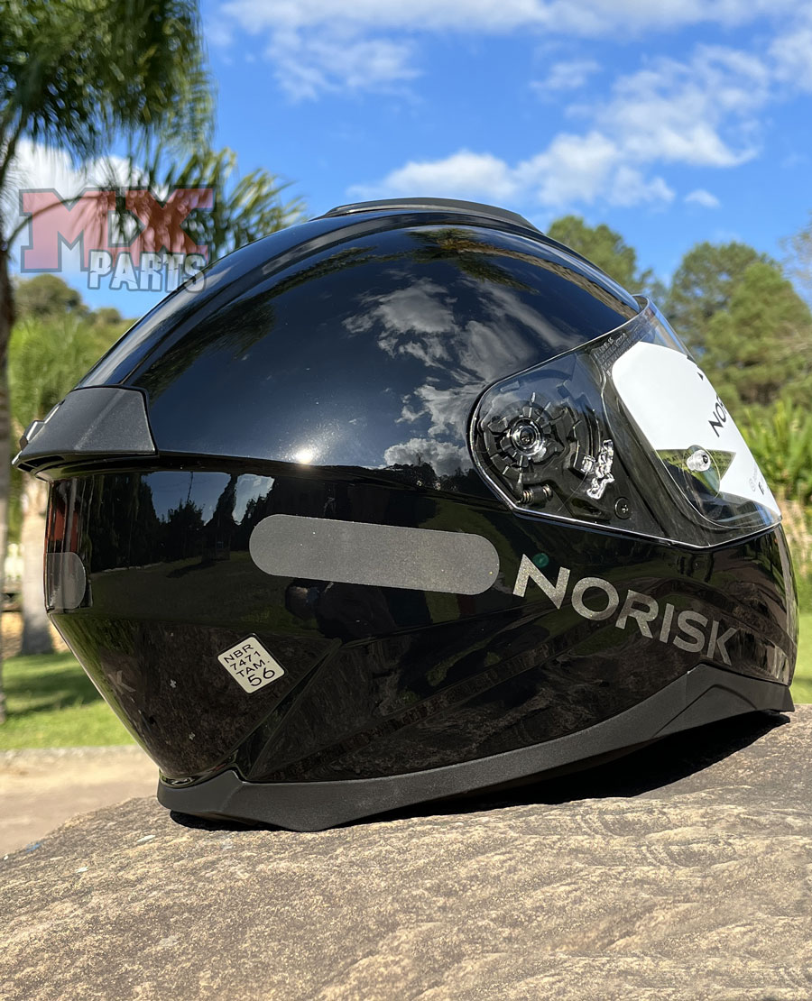 Outro destaque é a narigueira em tamanho alto que acompanha o Capacete Norisk Razor, pensada para reduzir a entrada direta de ar frio ou poeira no rosto durante a pilotagem. Para quem busca ainda mais proteção frontal, a narigueira pode ser substituída por um modelo maior (vendido separadamente).