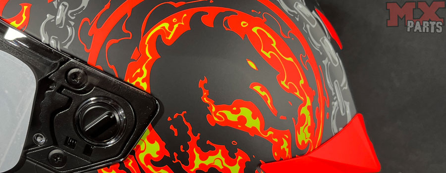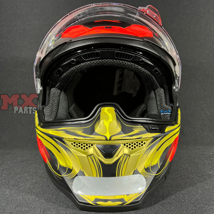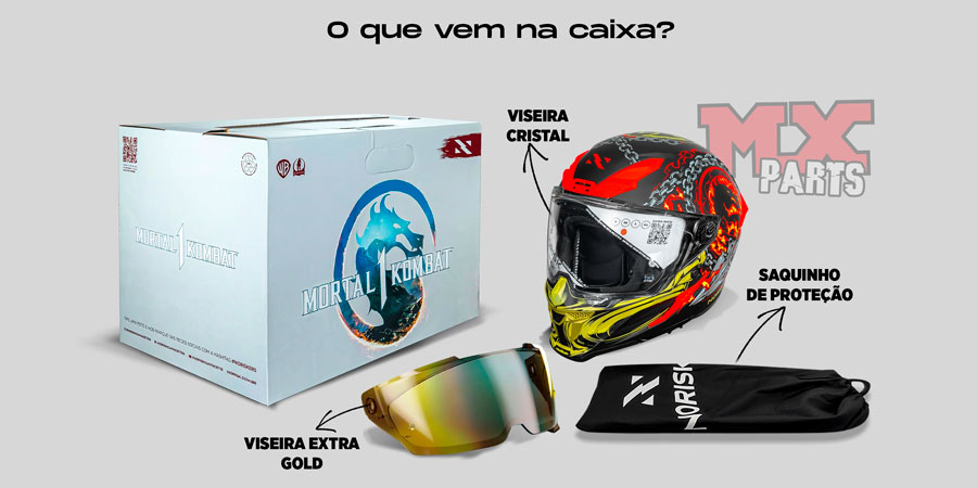 Capacete Norisk Rock Mortal Kombat Scorpion oferece ainda uma viseira extra fumê e óculos solar interno, facilitando a pilotagem sob sol intenso e garantindo troca rápida, sem necessidade de ferramentas.