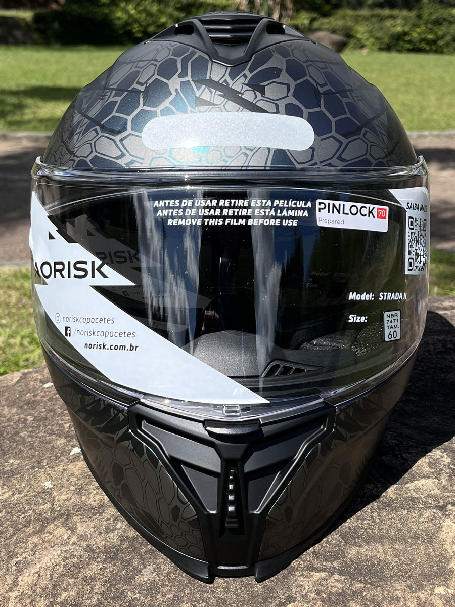 O casco do Capacete on-road Norisk Strada II é moldado por processo de injeção, que garante maior uniformidade na espessura da calota, melhor distribuição de impacto em caso de colisão e redução de pontos de fragilidade estrutural.