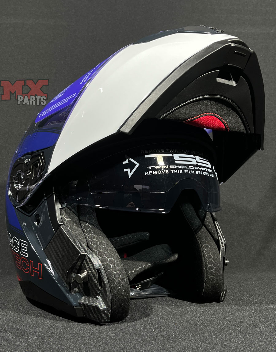 • Sistema articulado flip-up - permite a elevação da parte frontal do capacete, transformando ele em um modelo aberto, além de proporcionar praticidade em paradas rápidas sem necessidade de removê-lo completamente
