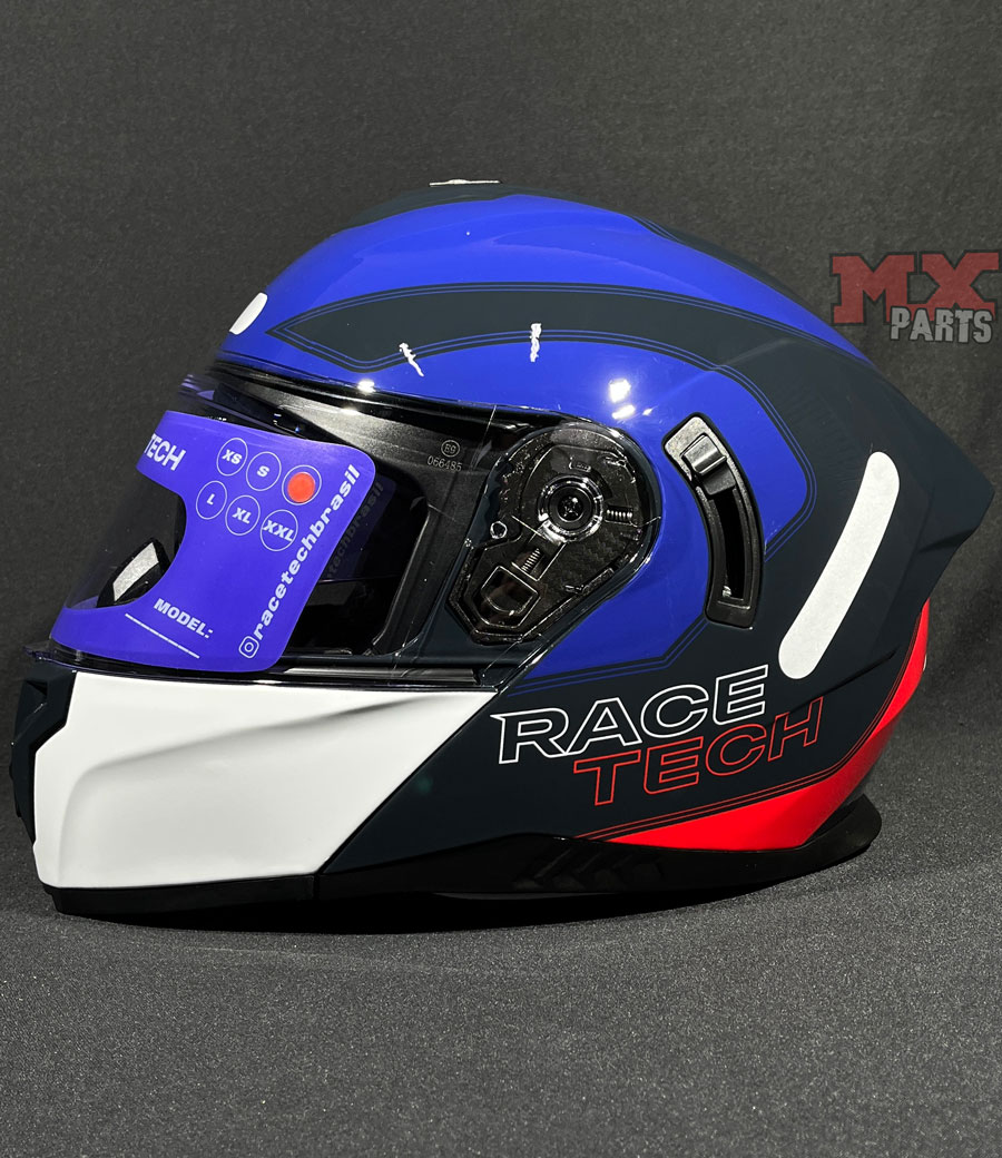 Capacete Race Tech Signal Active Articulado possui sistema de troca rápida da viseira, facilitando a substituição sem a necessidade de ferramentas, ideal para quem deseja alternar entre viseiras transparentes, fumês ou espelhadas.