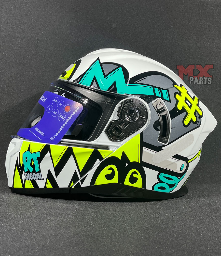 estrutura do Capacete Race Tech Signal Stuff Articulado é produzida em ABS de alta resistência, com excelente capacidade de absorver impactos e distribuir a energia gerada em colisões.