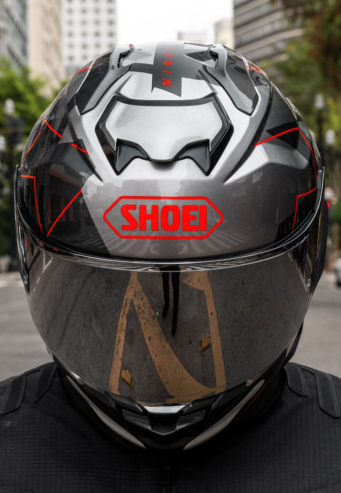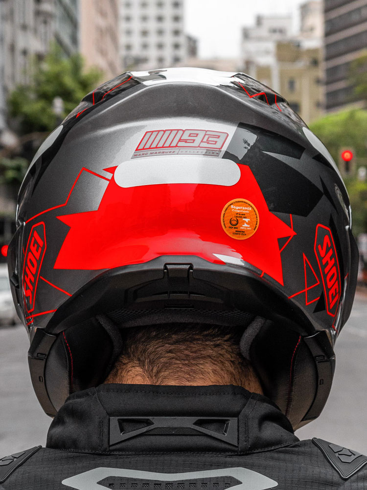 spoiler traseiro do Capacete Shoei GT-Air 3 aliado ao sistema de ventilação que contribui para a redução do arrasto, melhorando a circulação de ar para manter o piloto confortável em diversas condições climáticas.