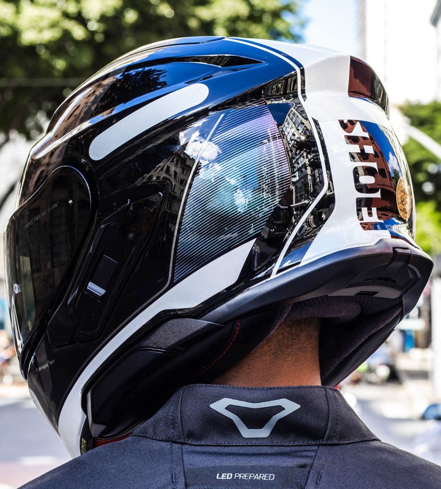 spoiler traseiro do Capacete Shoei GT-Air 3 aliado ao sistema de ventilação que contribui para a redução do arrasto, melhorando a circulação de ar para manter o piloto confortável em diversas condições climáticas.