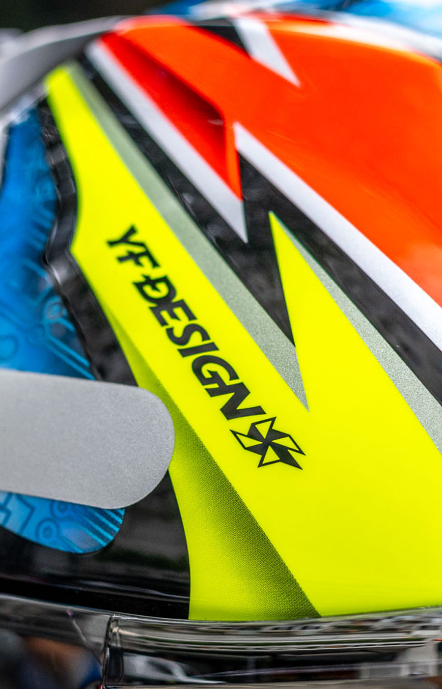 Seu formato apresenta um perfil mais compacto e esculpido, com spoiler integrado e canais de fluxo de ar estrategicamente posicionados para garantir menor turbulência e mais controle em competições e velocidades mais altas.