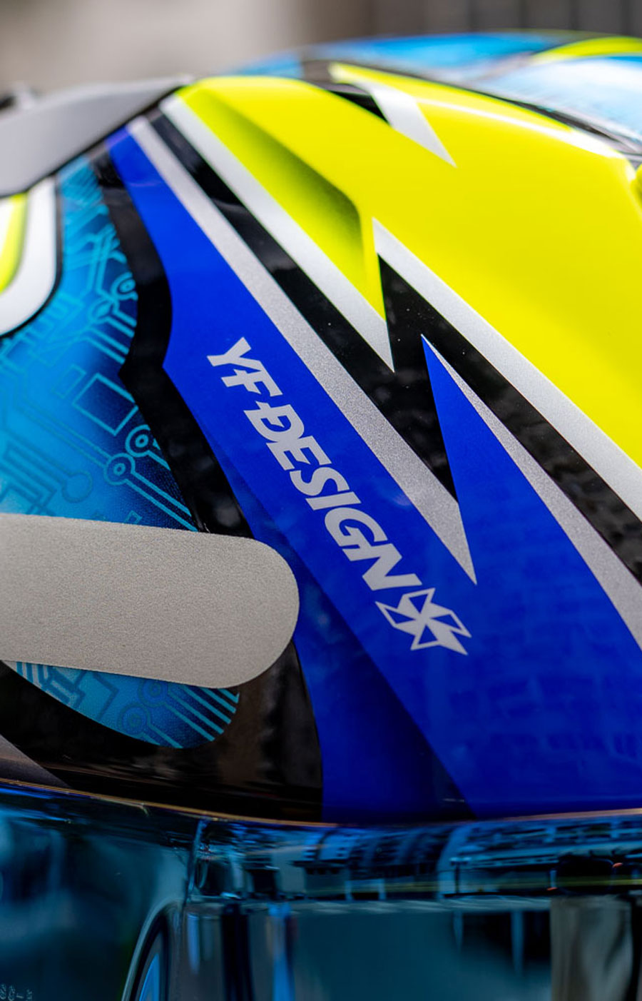 Seu formato apresenta um perfil mais compacto e esculpido, com spoiler integrado e canais de fluxo de ar estrategicamente posicionados para garantir menor turbulência e mais controle em competições e velocidades mais altas.