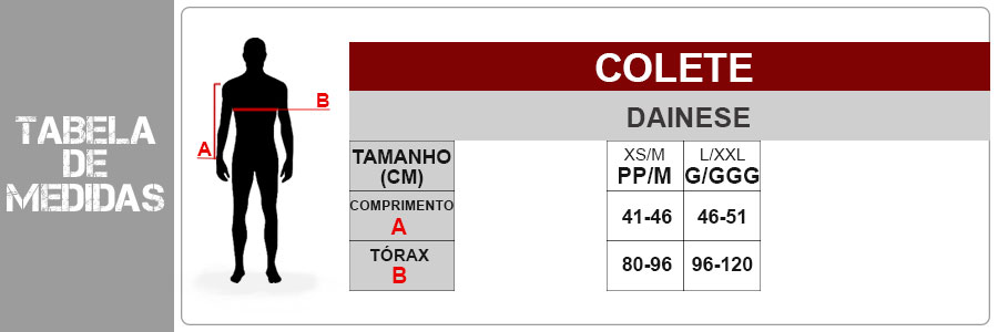 Confira as medidas do Colete Dainese MX2 Roost Guard: