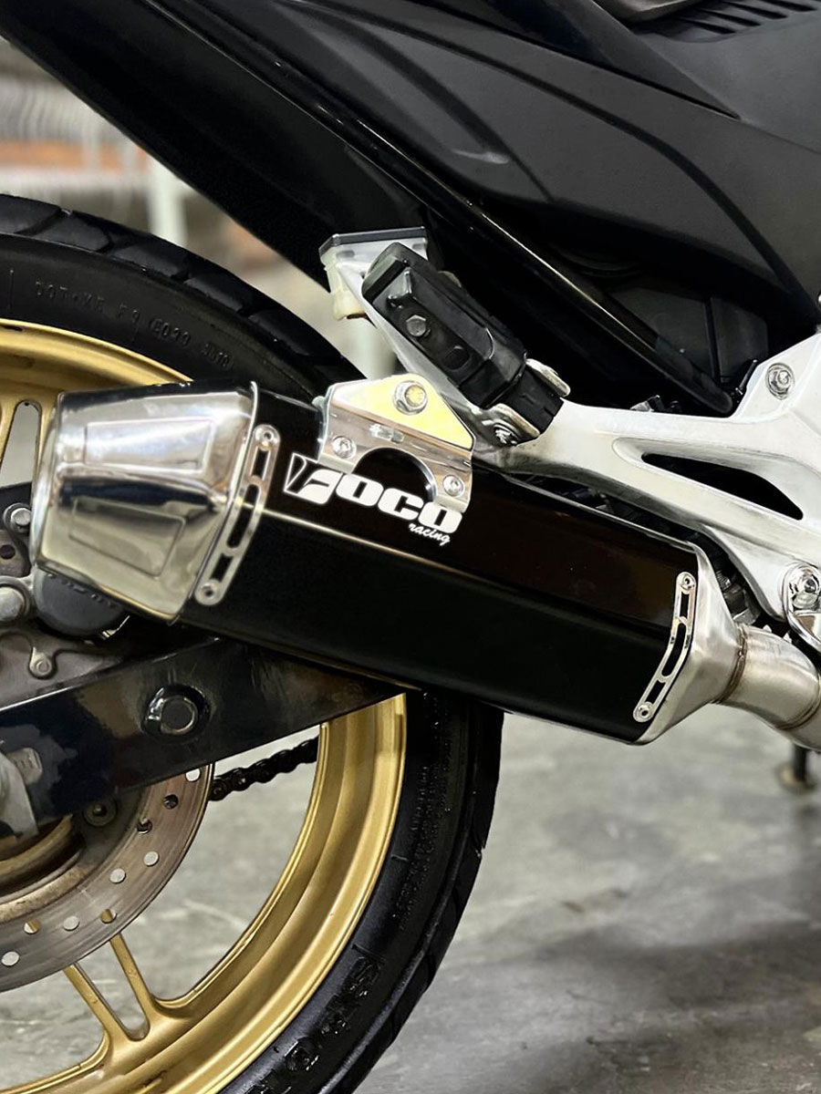 Além da composição em aço inox, o Escapamento Foco Racing para CB 300 conta com tubo e suporte em alumínio anodizado, altamente resistente ao calor e à ação de agentes externos, como poeira, umidade e variações climáticas.