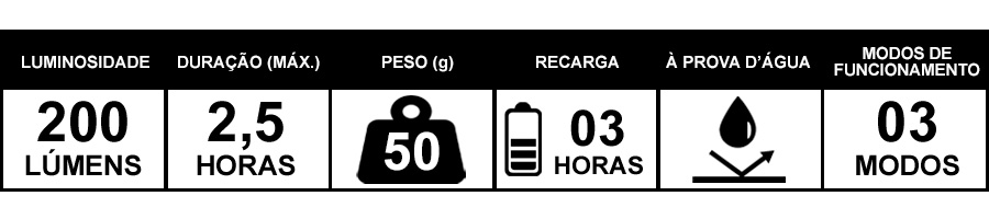 • Iluminação eficiente - com um led super brilhante de 3W, permite visibilidade lateral de até 180º com 200 lúmens no modo máximo