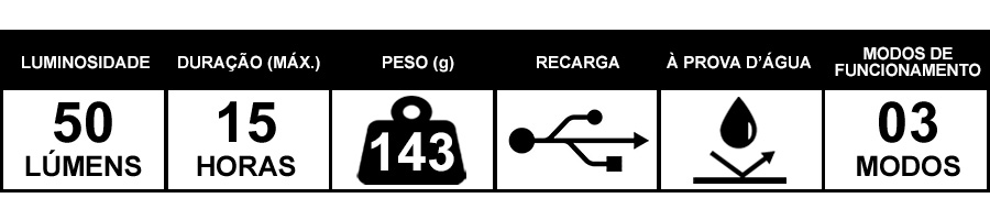 • Bateria durável - com capacidade para manter funcionamento por até 4 horas no modo 100% e 15 horas no modo estrobo