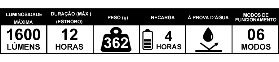 • 5 Modos de funcionamento - com emissão total de até 1600 lúmens no modo forte e 300 lúmens no modo estrobo, ainda conta com modo pulsante, médio e fraco