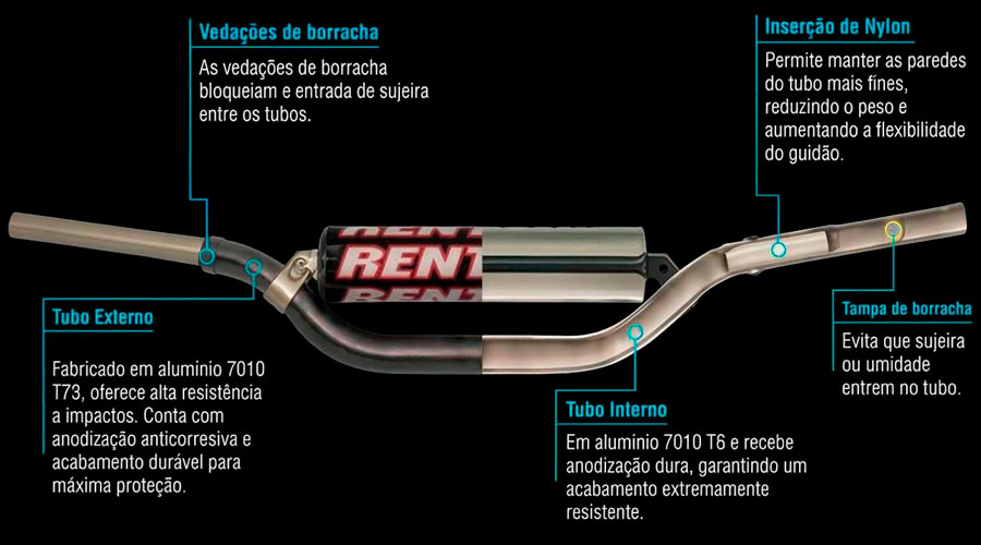 Graças ao design único o TwinWall não é um guidão qualquer. O tubo exterior é produzido de uma liga especial desenvolvida para ter uma resistência alta para danos mecânicos fazendo-o perfeito para as rigorosas condições do motocross e supercross.