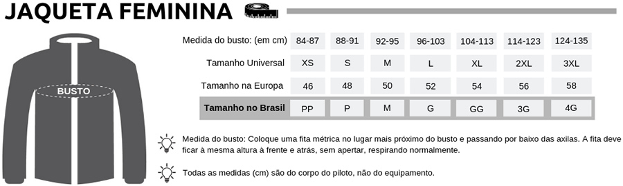 • Modelagem anatômica exclusiva para mulheres, com ajustes precisos de cintura, gola, bíceps, antebraço, punhos e barra traseira alongada, para maior proteção lombar