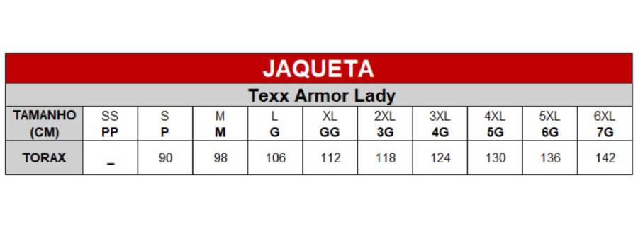 *Confira as Medidas da Jaqueta Texx Armor Lady Feminina: