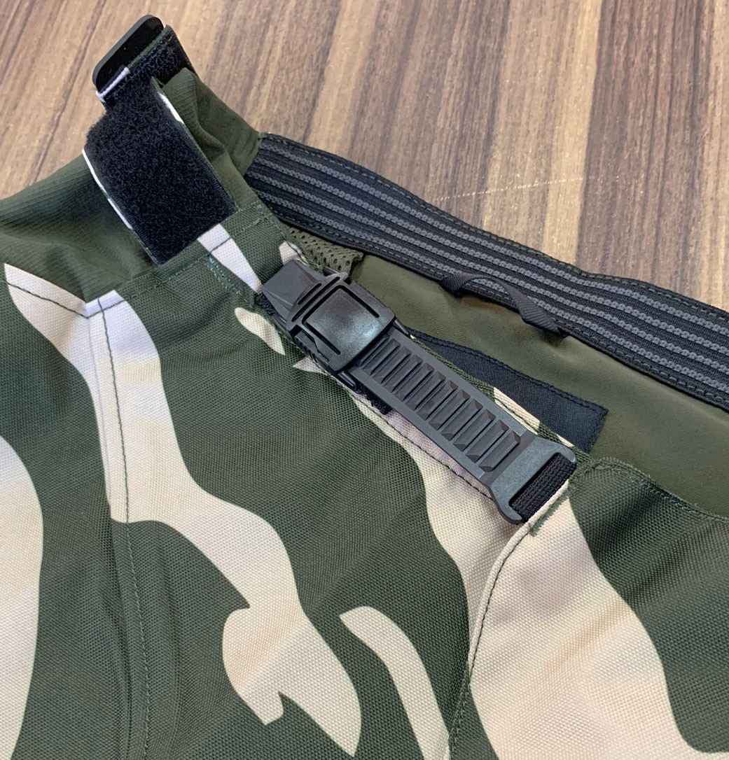 Além disso, possui um painel elástico invisível nas dobras dos joelhos, possibilitando maior mobilidade e ventilação, mesmo com o uso de joelheiras articuladas ou convencionais, já que o espaço possibilita melhor adaptação de proteções para o joelho.
