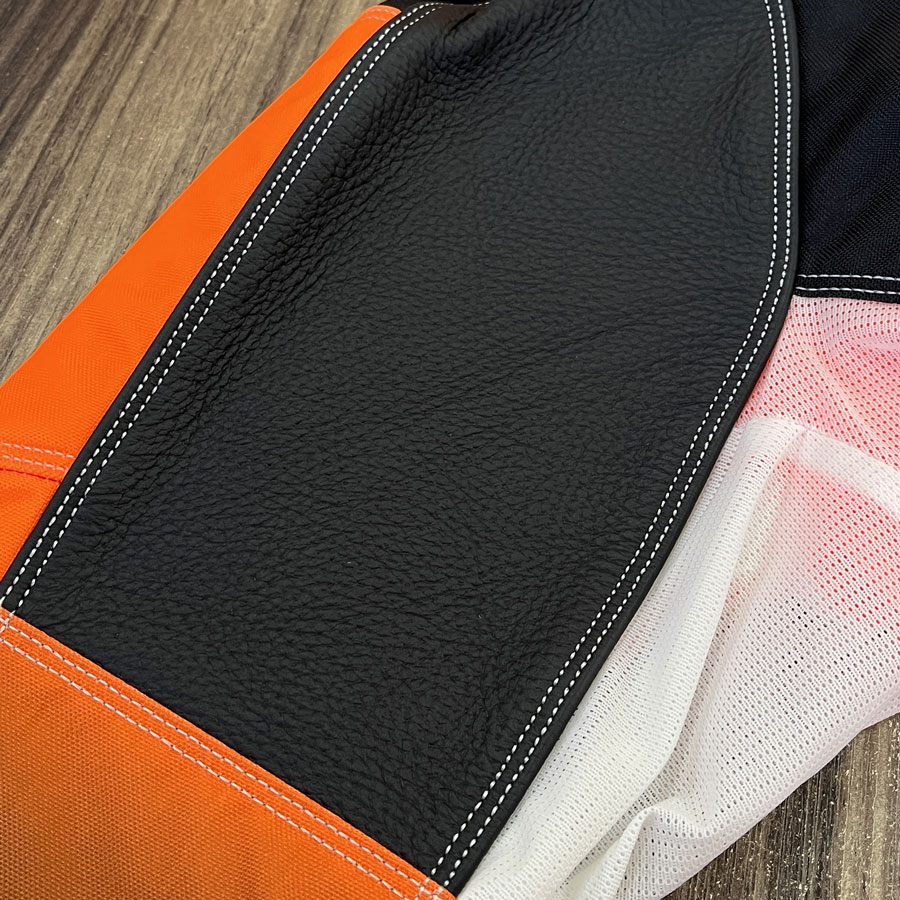 • Painéis em couro bovino natural - posicionados na parte interna dos joelhos, permite que a proteção contra o calor e atritos seja muito maior