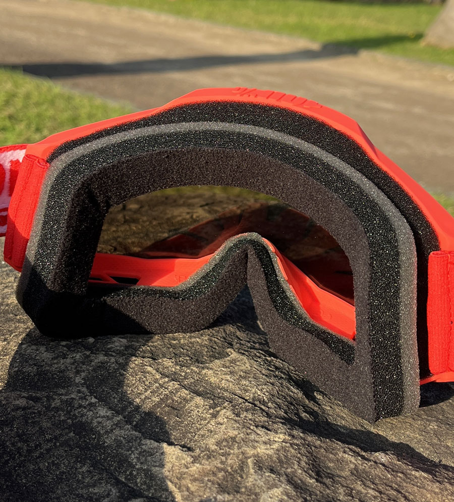 Óculos 100% Accuri 2 possui três espumas hipoalergênicas que geram uma maior maciez ao contato com a pele, ajudando a prevenir irritações e que objetos e sujeiras entrem em contato direto com o rosto.