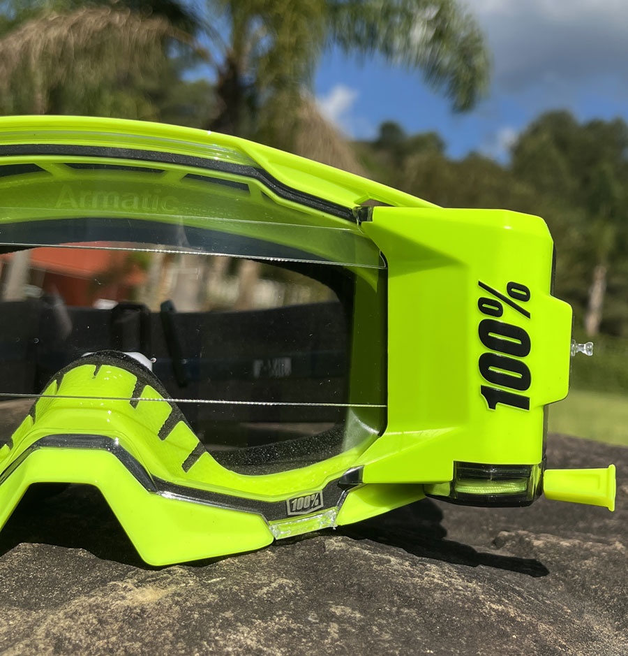 A bobina com filme do Óculos para motocross 100% Armatic Forecast é puxada e automaticamente enrolada garantido visão clara em segundos, garantindo muito mais praticidade para manter seu nível máximo em performance.