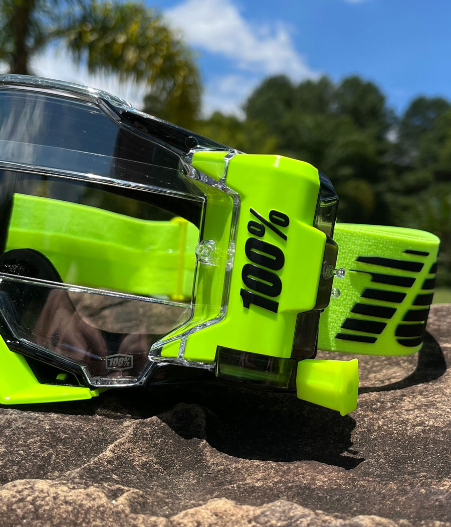 A bobina do Óculos motocross 100% Armega Forecast com filme é puxada e automaticamente enrolada garantido visão clara em segundos, garantindo praticidade para sua pilotagem se manter no máximo de performance.
