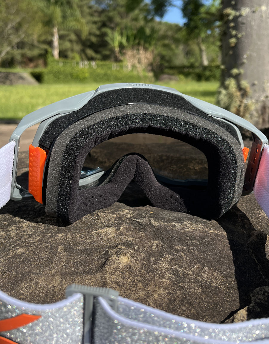 Óculos 100% Armega ainda conta com nosepad (narizeira) integrada removível para maior proteção contra impactos e sujeiras, garantindo ainda mais conforto em sua pilotagem.