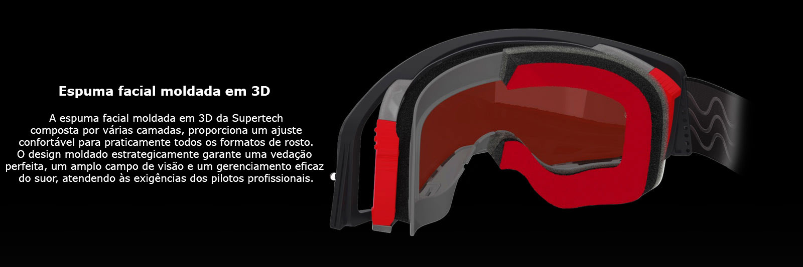 Óculos Alpinestars Supertech Corp possui em seu interior três camadas de espumas, com alta qualidade e moldagem 3D, que impedem a entrada de sujeiras e evitam que a umidade atrapalhe sua visão para máximo conforto durante a pilotagem.
