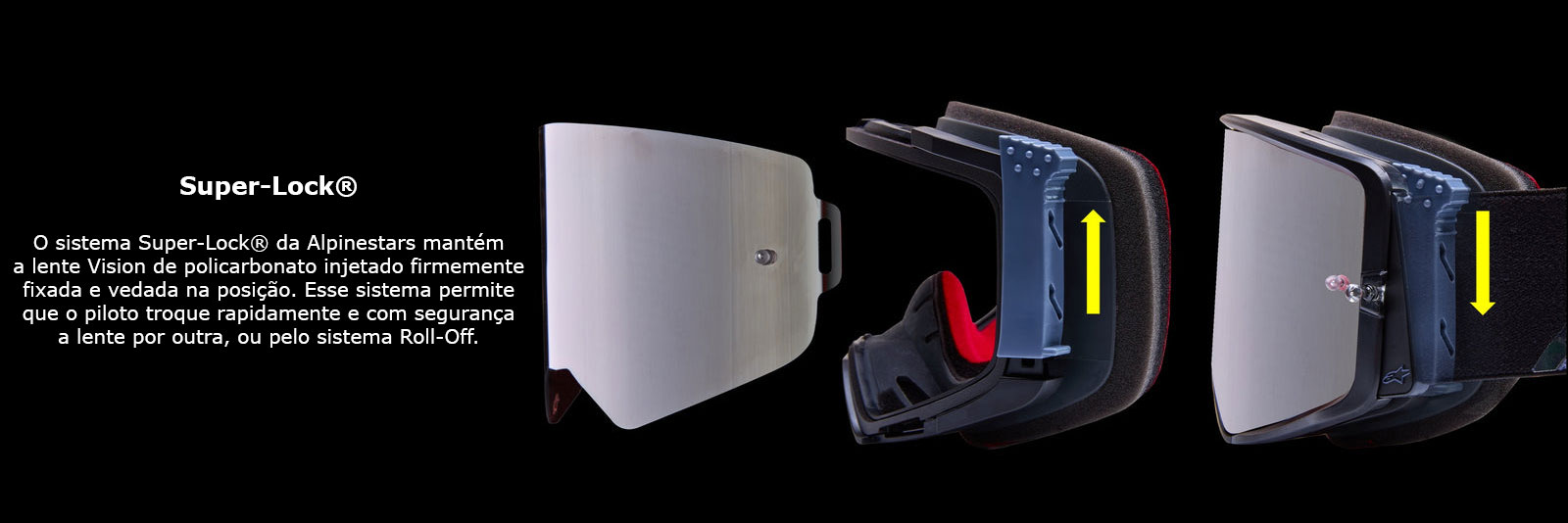 • Sistema Super-Lock® - sistema de travamento exclusivo da Alpinestars, permitindo trocas rápidas e seguras das lentes motocross